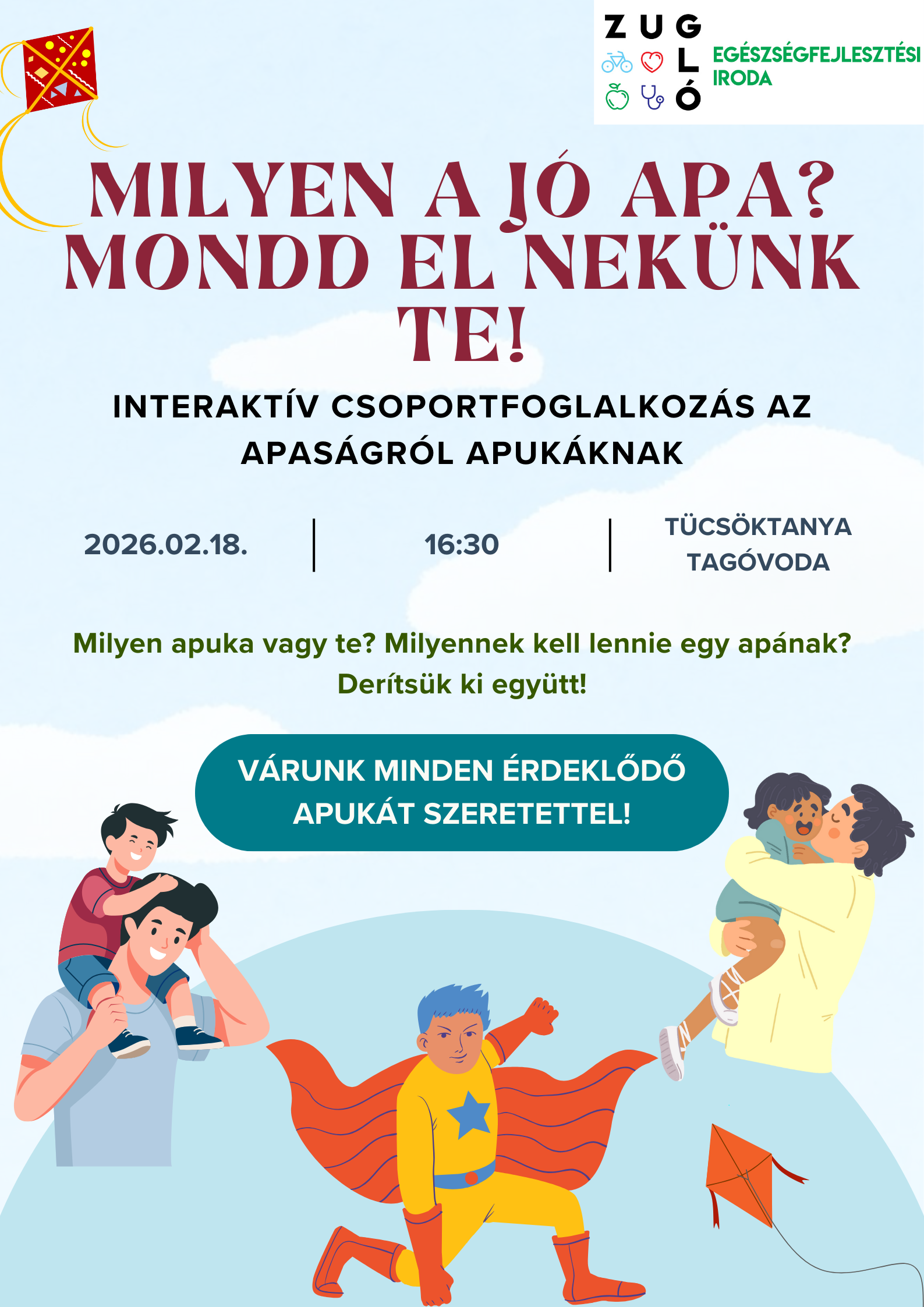 Milyen a jó apa? Derítsük ki együtt! Interaktív csoportfoglalkozás az apaságról apáknak a Tücsöktanyába járó gyermekek apukáinak.