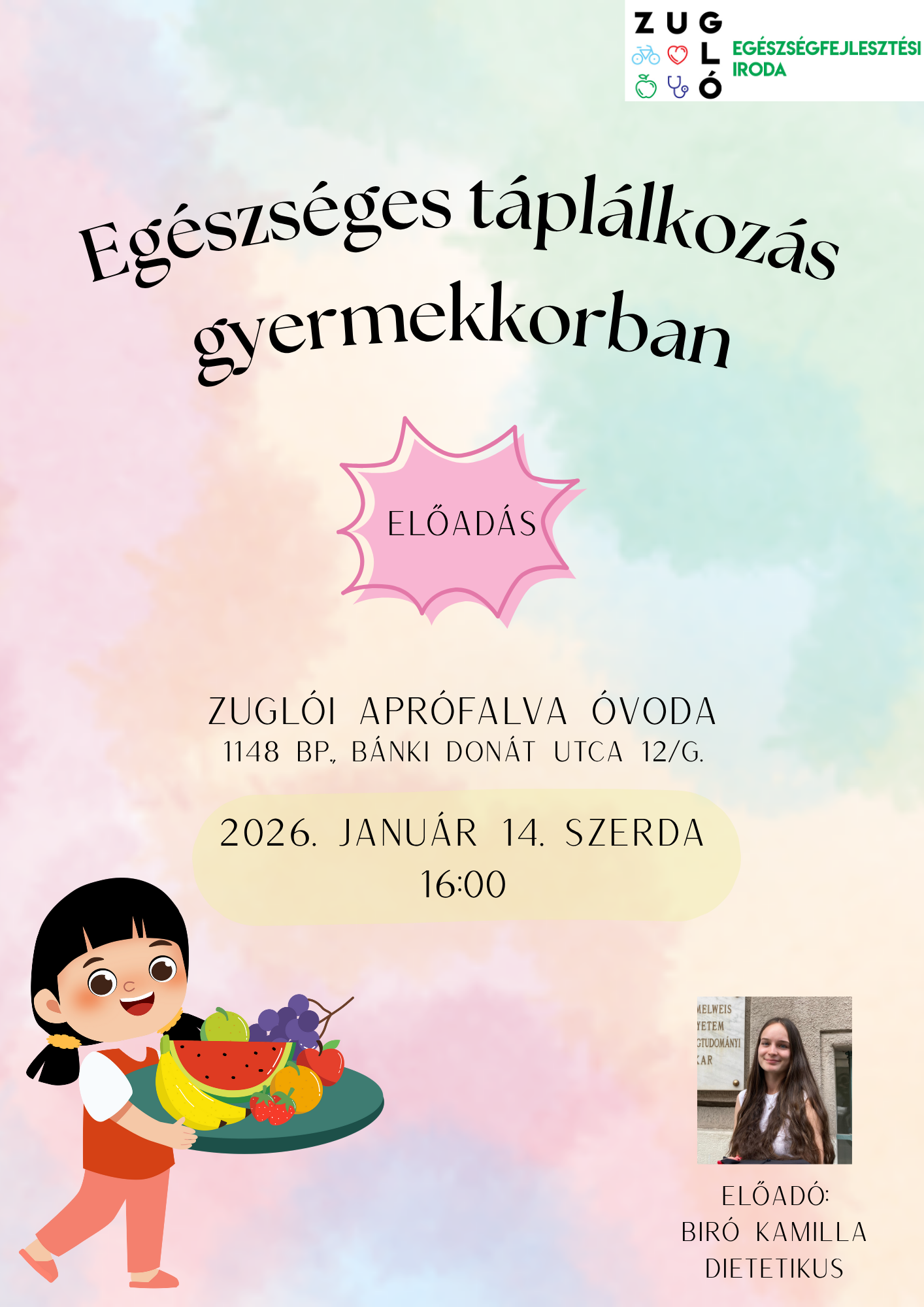 Irodánk dietetikusa tart előadást az Aprófalva Tagóvodába járó gyermekek szüleinek Egészséges táplálkozás gyermekkorban címmel.