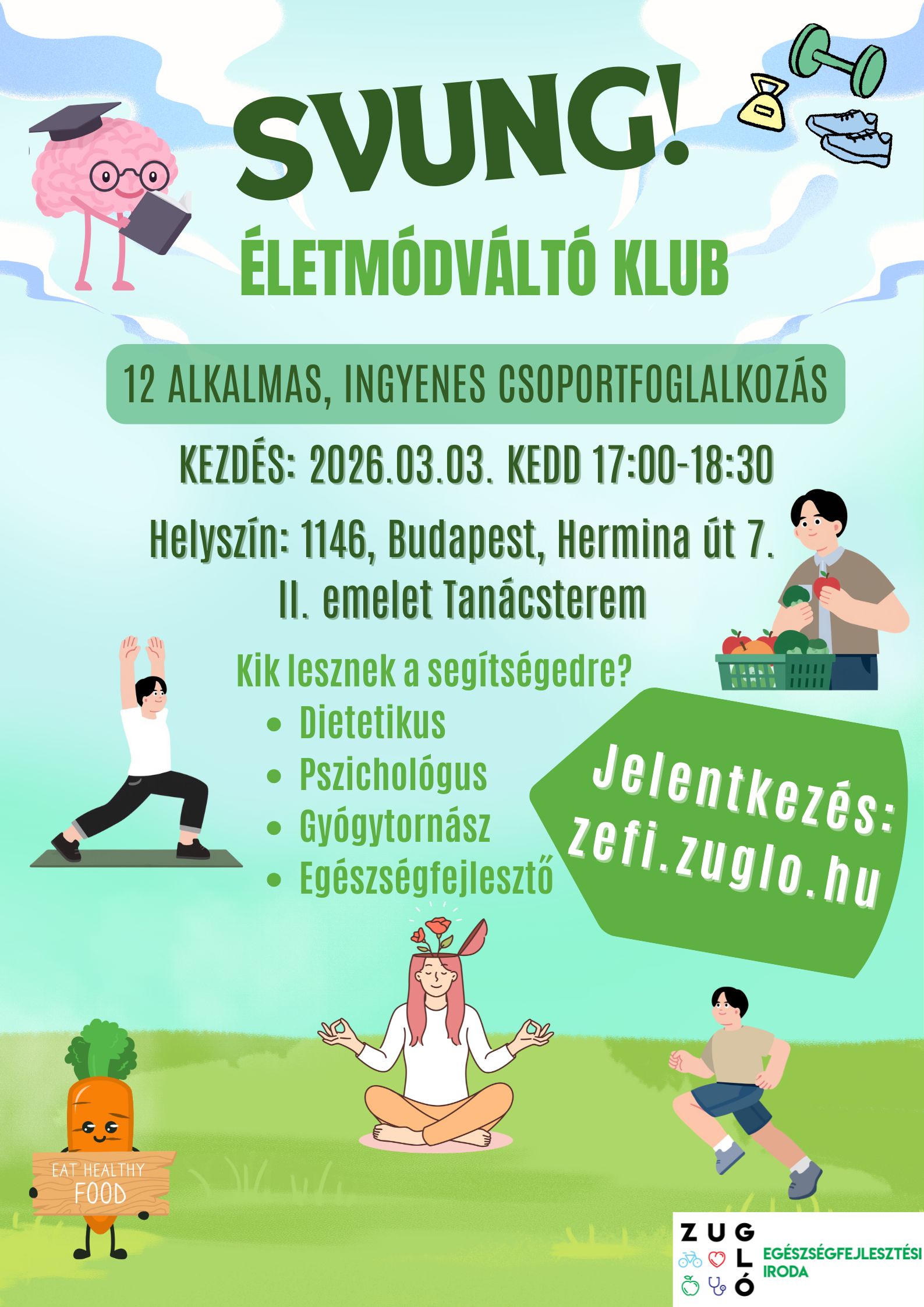 Zuglói lakosok és zuglói munkahellyel rendelkezők jelentkezését várjuk 12 alkalmas, ingyenes életmódváltást elősegítő csoportfoglalkozásunkra.