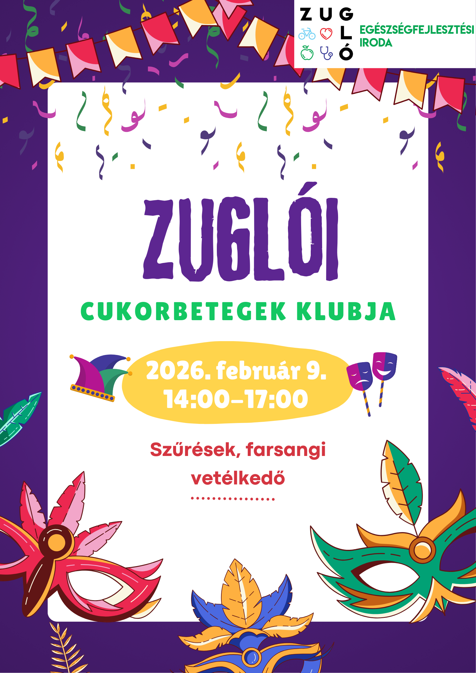 A februári Zuglói Cukorbetegek Klubja alkalmán a farsangé a főszerep, tréfás vetélkedő, farsangi versek, dalok lesznek porondon, a jókedv garantált!