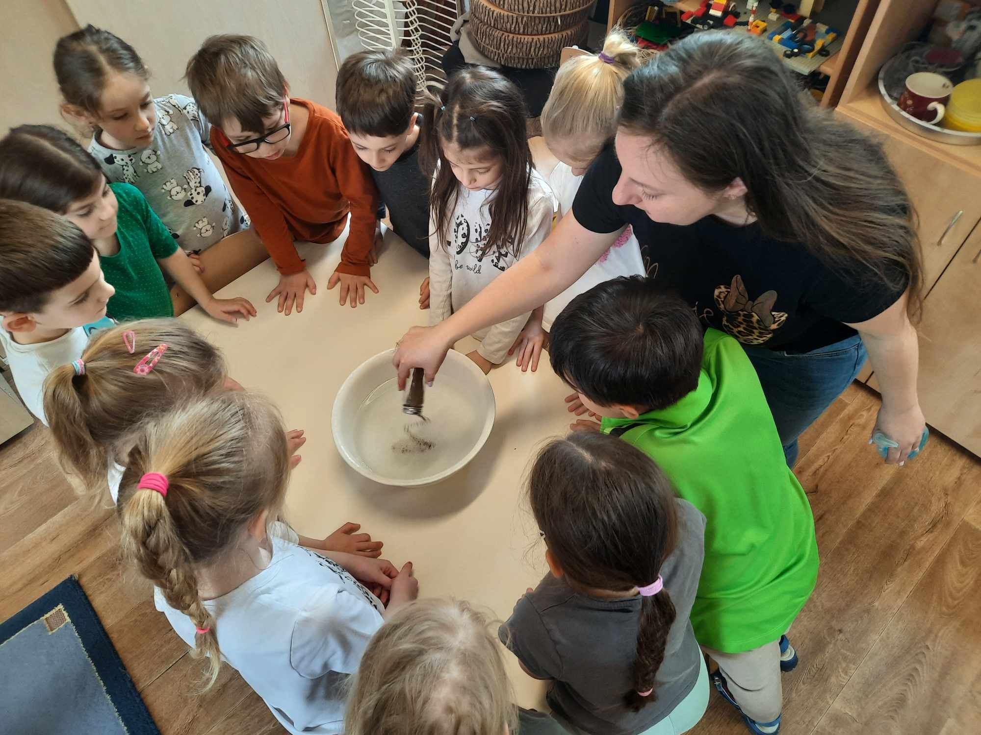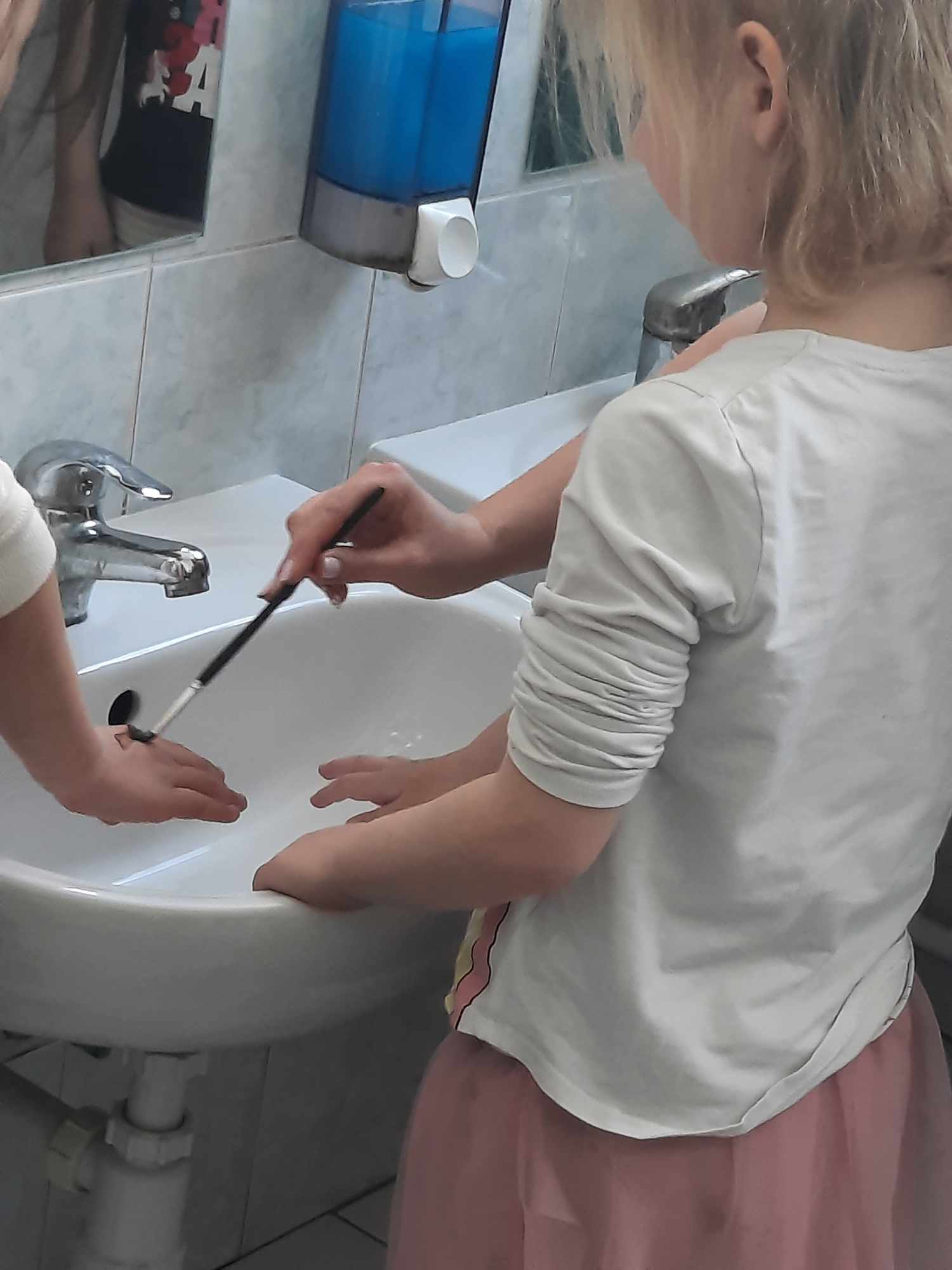 A gyerekeknek játékos formában igyekszünk átadni a higiénia fontosságát, közösen mutattuk be, hogyan kell helyesen kezet mosni, illetve modelleztük hogyan reagálnak a bacik a szappan hatására.